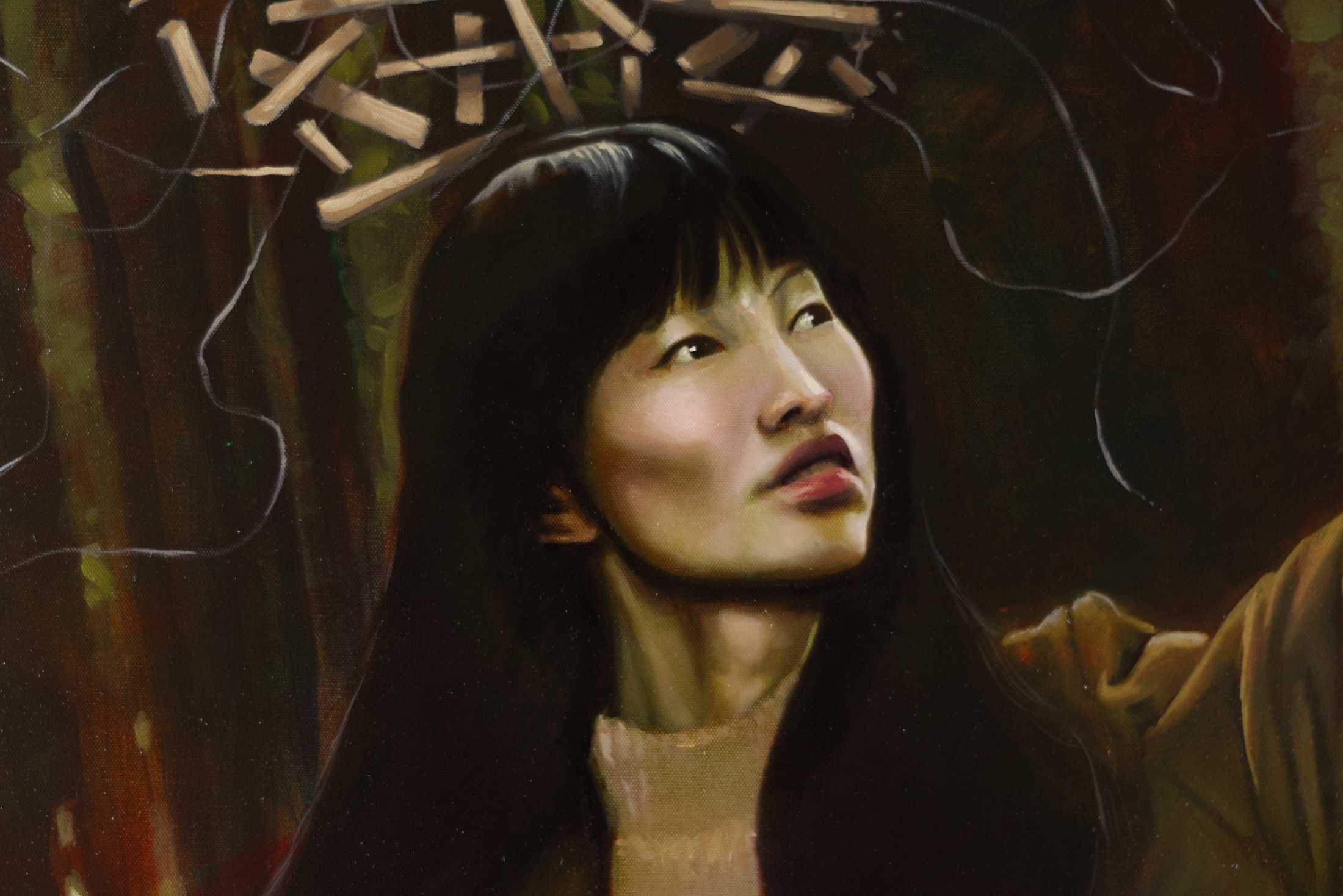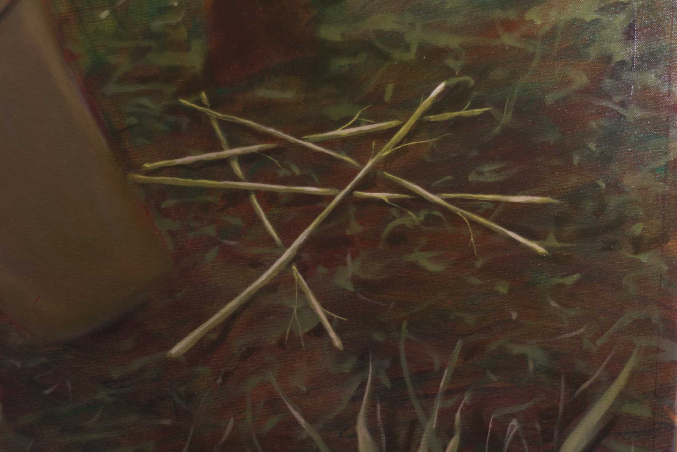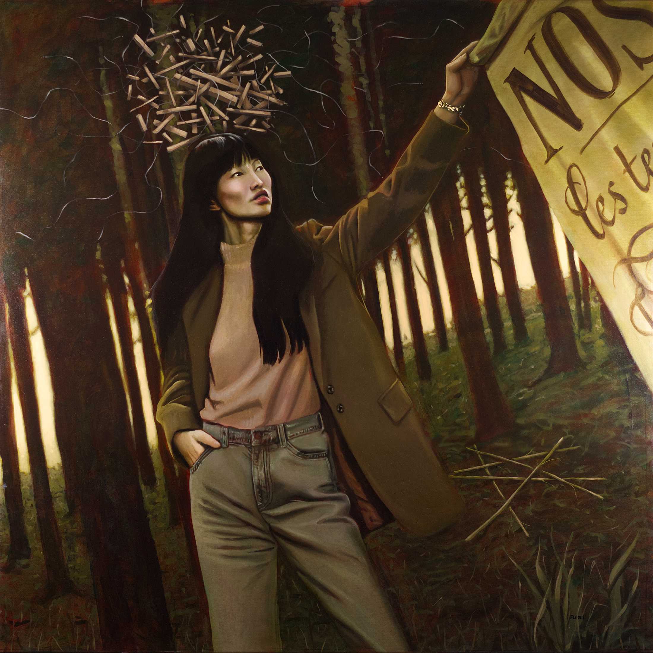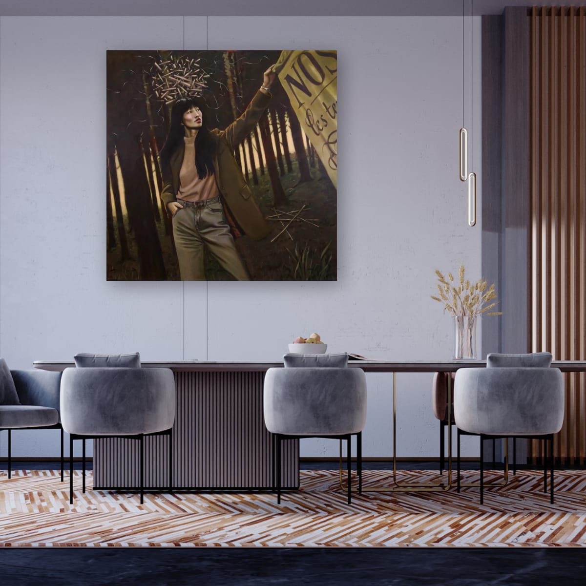 In “Queen of Chaos,” a striking figure stands amidst a dense forest, embodying strength and defiance. The subject, with her confident posture and contemplative gaze. Above her, a chaotic arrangement of sticks creates a crown-like effect, symbolizing the complexities of thought and emotion. The muted tones of the forest backdrop contrast with her modern attire, merging the natural and the contemporary. This artwork invites reflection on the balance between chaos and control, making it a compelling addition to any space that seeks to inspire dialogue and introspection.