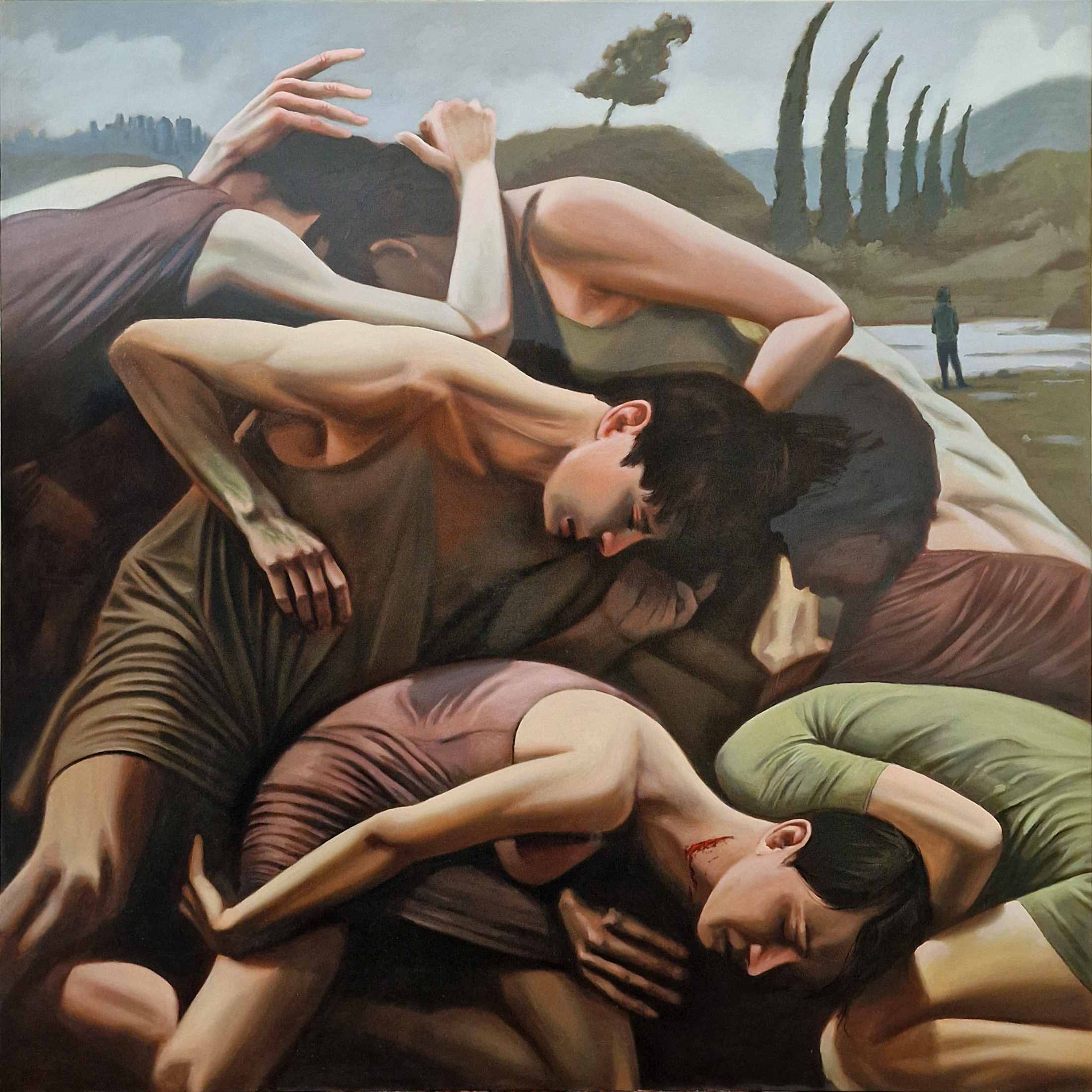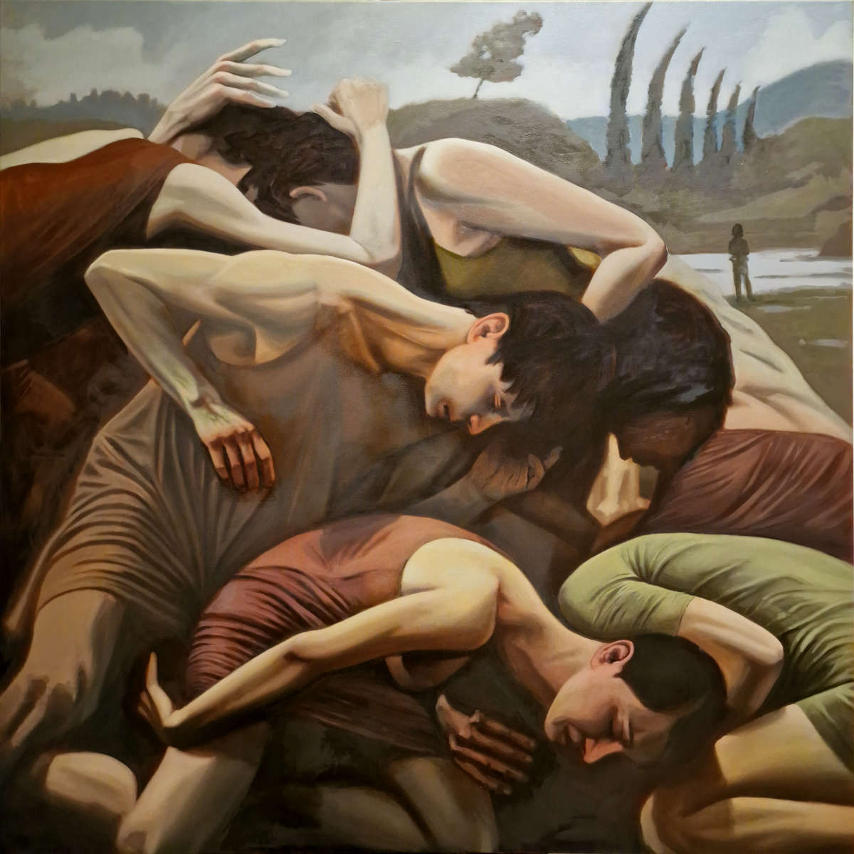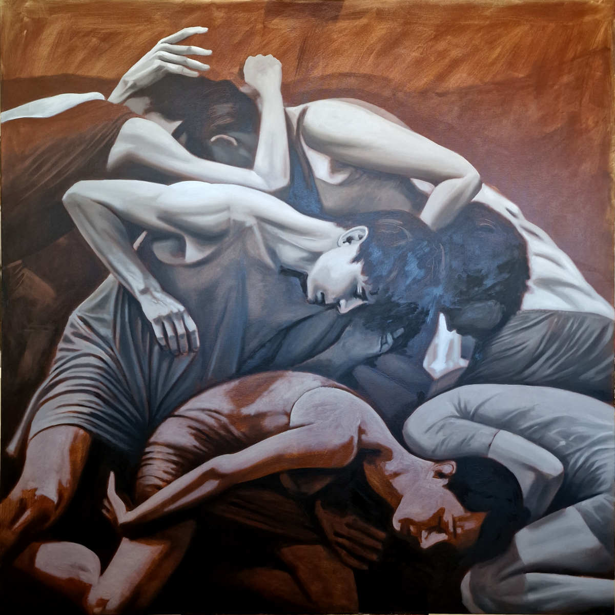 This large-scale work (140x140cm) is a visceral exploration of the “social game”—that unspoken, labyrinthine rulebook that governs human interaction. The composition presents a mass of bodies collapsing into one another, forming a heavy, organic architecture. They are tangled in a way that feels inextricably bound yet profoundly disconnected. Here, the act of mingling is stripped of its cocktail-party veneer and revealed as a raw, physical weight.