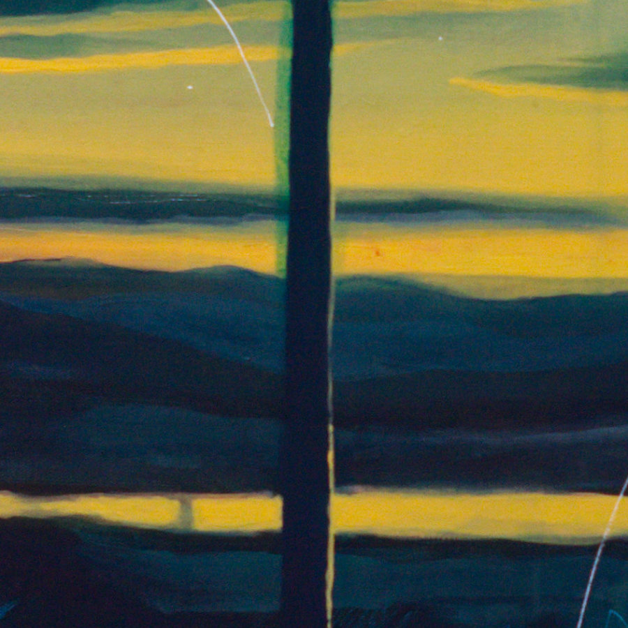 This abstract landscape artwork invites contemplation with its surreal depiction of a night sky illuminated by stars. The interplay of deep blues and vibrant yellows creates a dreamlike atmosphere, evoking a sense of wonder and exploration.